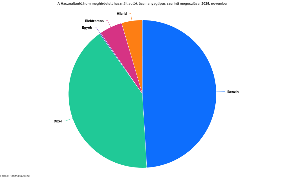 November egyik legérdekesebb fejleménye, hogy a használtautó-piacon gyakorlatilag eltűnt az árkülönbség a hibrid és az elektromos hajtású autók között. Mindkét kategória átlagára 11,5 millió forint körül alakult, miközben éves szinten mindkét hajtástípusnál érdemi árcsökkenés volt megfigyelhető. A hibrid autók esetén ez 4,7 százalékos, míg az elektromosok esetében 8,5 százalék-os árcsökkenést jelent egy év alatt. A vizsgált időszakban a benzines és a dízeles személygépjárművek ára hasonló mértékben változott, egymáshoz közeli átlagárakkal. A megfigyelt hónapokban a dízelüzemű autók átlagosan 5,5 százalékkal drágábbak voltak, mint a benzinesek.
