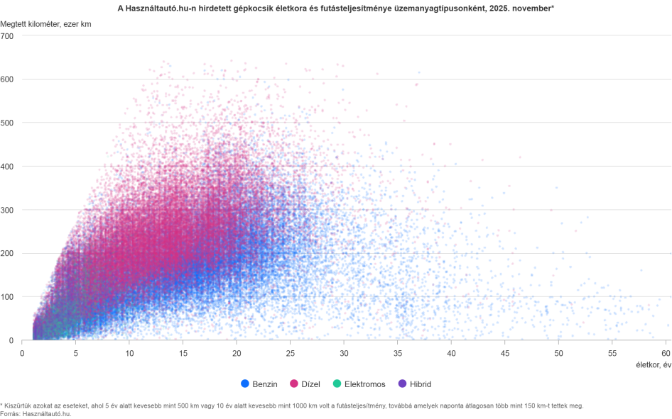 A benzines autók átlagosan 154 ezer, a dízelmeghajtású modellek 220 ezer kilométert futottak, ami azt jelenti, hogy a dízelek átlagosan 42,9 százalékkal nagyobb futásteljesítménnyel szerepeltek a kínálatban. Az átlagéletkor tekintetében a benzines autók 13,7, a dízelek 12,3 évesek voltak. A dízeles személygépjárművek átlagéletkorában egy év alatt 1,7 százalékos emelkedés, míg a benzinesek esetén 0,7 százalékos csökkenés volt megfigyelhető.