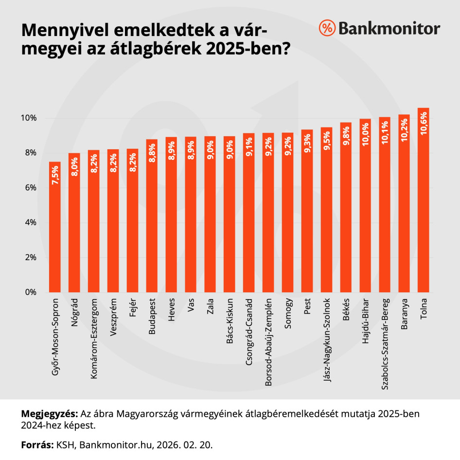 A Budapest és vidék közötti bérszakadék folyamatosan szűkül. Míg 2019-ben a legalacsonyabb bruttó átlagkeresettel bíró Szabolcs-Szatmár-Bereg megye bérszínvonala a budapestinek csupán 55,6 százalékát érte el, ez az arány 2025-re 61,5 százalékra emelkedett. Tehát az alacsonyabb átlagbérekkel rendelkező vármegyék felzárkózási folyamata, ha tyúklépésben is, de halad.