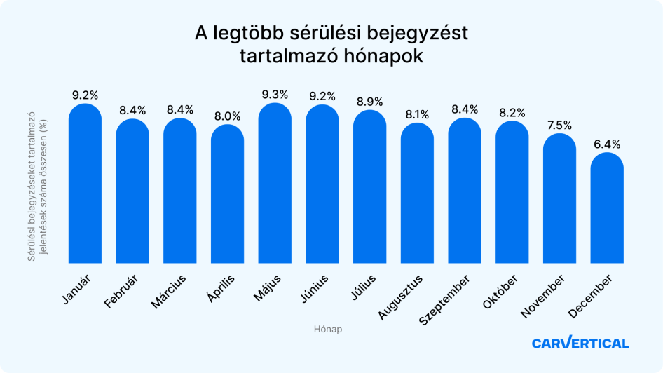 „Ezeket a kiugró értékeket részben a januári kedvezőtlen útviszonyok, valamint a tavasszal és a nyár elején megnövekedett forgalom magyarázhatja. Ahogy emelkedik a hőmérséklet, az autósok magabiztosabban vezetnek – a sűrűbb forgalommal együtt ez azonban gyakran növeli a balesetek kockázatát” – magyarázza Matas Buzelis, a carVertical autópiaci szakértője.