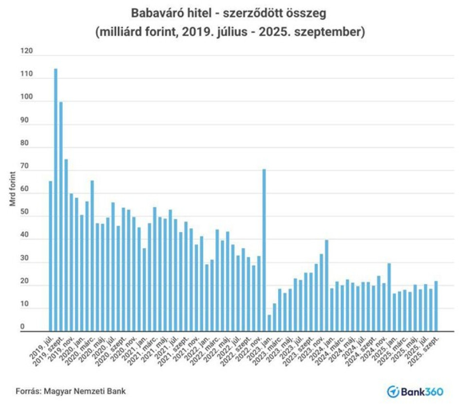 Az állami kamattámogatással igénybe vehető babaváró hitelből szeptemberben 21,81 milliárd forint fogyott, ez 2025-ben a legjobb eredmény. Az augusztusi 18,36 milliárd forinthoz képest megközelítőleg 19 százalékkal nőtt a kihelyezett összeg, tavaly szeptemberhez képest pedig 10 százalékkal. A program 2019-es indulása óta összesen 2794 milliárd forint babaváró hitelt vettek fel a fiatal házaspárok.
