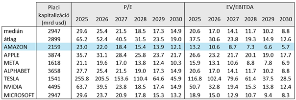 Az Amazon értékeltsége néhány évvel ezelőtt még rendkívül magas volt, az előző öt évben átlagosan 33,1-es P/E rátán forgott, de az utóbbi két év átlaga is 27,1. A 2026-os eredményvárakozásokkal számolt 22-es érték ennél jóval mérsékeltebb. A Magnificent 7 egykor legdrágább tagjából pár év alatt a második legolcsóbb lett. Jövőre a robusztus növekedésnek köszönhetően a P/E ráta 18,4-re, 2028-ban pedig 15,4-re csökkenhet. Ez alapján indokoltnak tűnik, hogy az árfolyam is magasabbra emelkedjen.