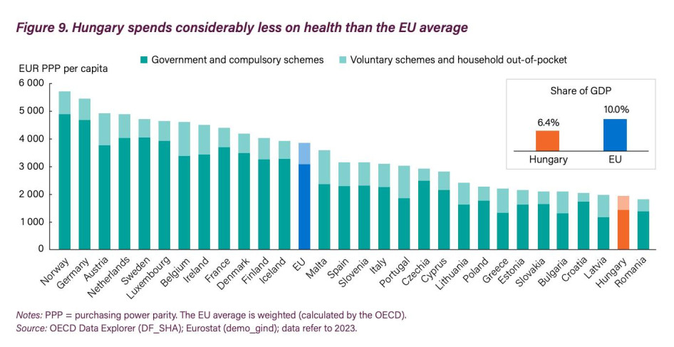 Az egy főre jutó egészségügyi kiadás Magyarországon viszonylag alacsony, 1 925 euró, ami megközelítőleg az EU-átlag fele.