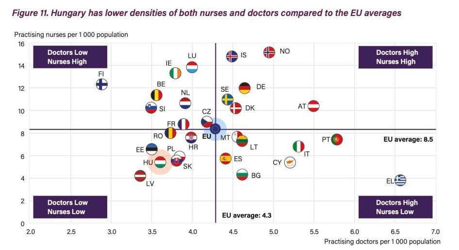 Az OECD legfrissebb tanulmánya nem fest jó képet a magyar egészségügy állapotáról. A legfontosabb mutatókban jelentős a lemaradás a többi uniós tagállamhoz képest. Az orvosok és nővérek száma alapján a legrosszabb kategóriába került Magyarország.