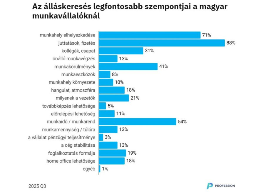 A munkahelyváltás során mérlegelt szempontok fontossági sorrendje változatlan az elmúlt években, az arányokban azonban megfigyelhető némi eltolódás. A korábbinál még fontosabbá vált a fizetés és juttatási csomag mértéke: míg az előző évben a jelöltek 85 százaléka, idén már 88 százalék-uk tekinti ezt elsődleges prioritásnak. Ezt követi a munkahely elhelyezkedése, a munkaidő, majd a munkakörülmények – miközben a vezető személye némiképp kevésbé játszik szerepet a döntésük meghozatalában.