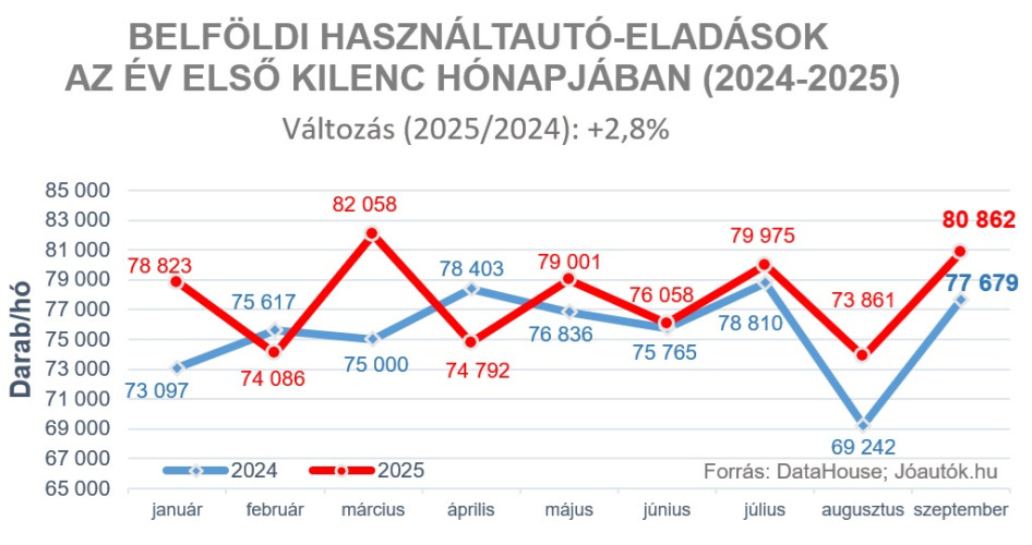 Miközben a használtautó-piacon 2025 első három negyedévében gazdát cserélő 699 600 személyautó mennyisége 2,8 százalékkal magasabb az előző év hasonló időszakában regisztrált 680 400-as értéknél, az importált használt autók száma ugyanebben a periódusban 94 600 darab volt, ami 15,2 százalékkal múlja felül az egy évvel korábban mért 82 100-as értéket.