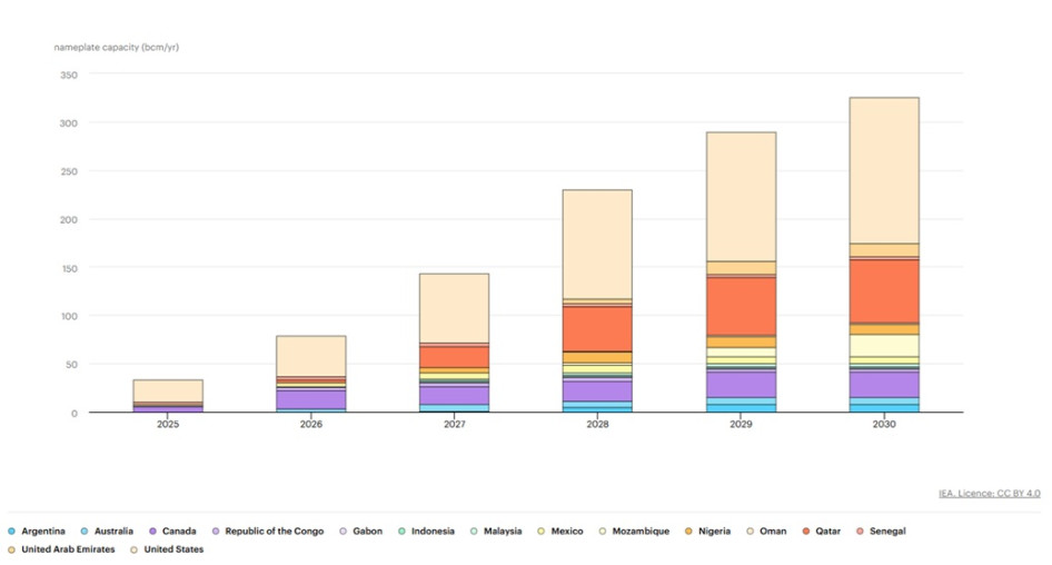Az LNG kapacitások bővülése 2025-2030, milliárd köbméter/év