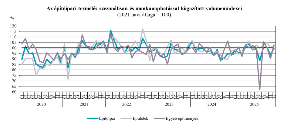 A szezonálisan és munkanaphatással kiigazított indexek alapján az építőipar termelése 6,7 százalékkal nagyobb volt a 2025. novemberinél. 2025-ben az építőipari termelés volumene 2,8 százalékkal haladta meg az előző évit. Január–decemberben az építőipar termelői árai átlagosan 5,4 százalékkal magasabbak voltak a 2024. azonos időszakiaknál.
