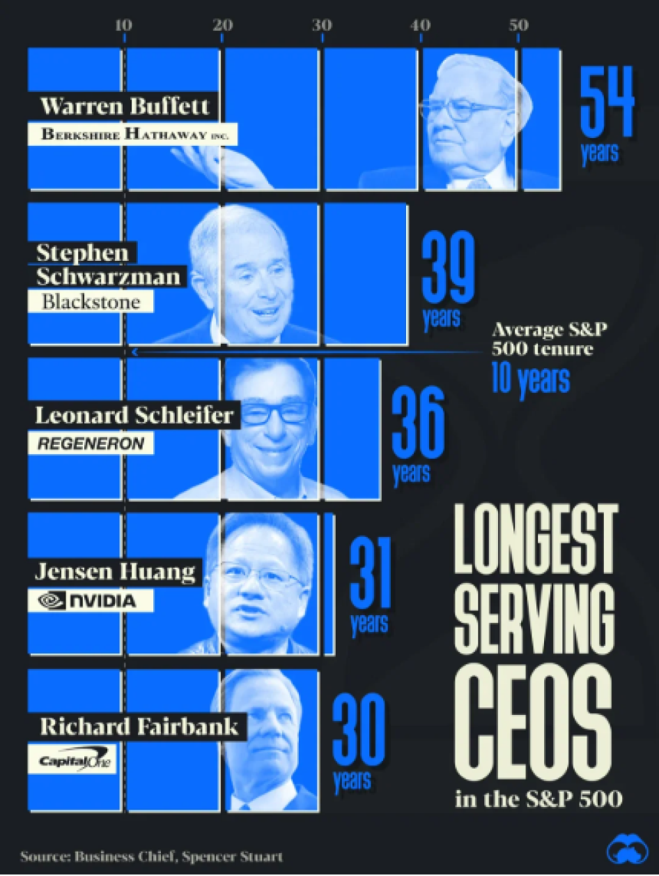 Az S&P 500 indexben szereplő vállalatok vezérigazgatóinak átlagos megbízatási ideje 7-10 év, az átlagérték pedig még alacsonyabb, körülbelül 5-6 év. Buffett messze a leghosszabb ideje hivatalban lévő vezérigazgató a vállalatvezetők között. Egy másik érdekes tény, hogy Warren Buffett 95 éves, míg a konkurens vezérigazgatók átlagéletkora 57 év.
