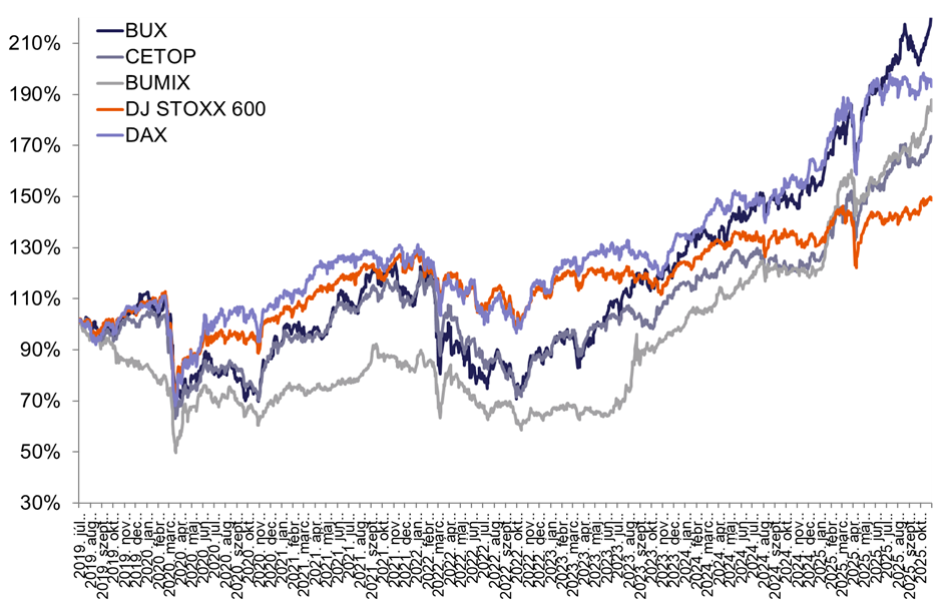 A hazai tőkepiacon az előző havi megtorpanást követően ismét élénk aktivitás volt tapasztalható. Folytatva a növekvő tendenciát, 8,5 százalékos emelkedéssel 107 319,9 ponton ért célba a hónap végén a BUX, mely egyúttal új napi rekord is lett. A BÉT további meghatározó indexei közül a CETOP NTR 2 292,5 ponton, míg az XTEND index 1 776,1 ponton fejezte be a hónapot, tükrözve a tőzsde további szegmenseinek stabil teljesítményét.