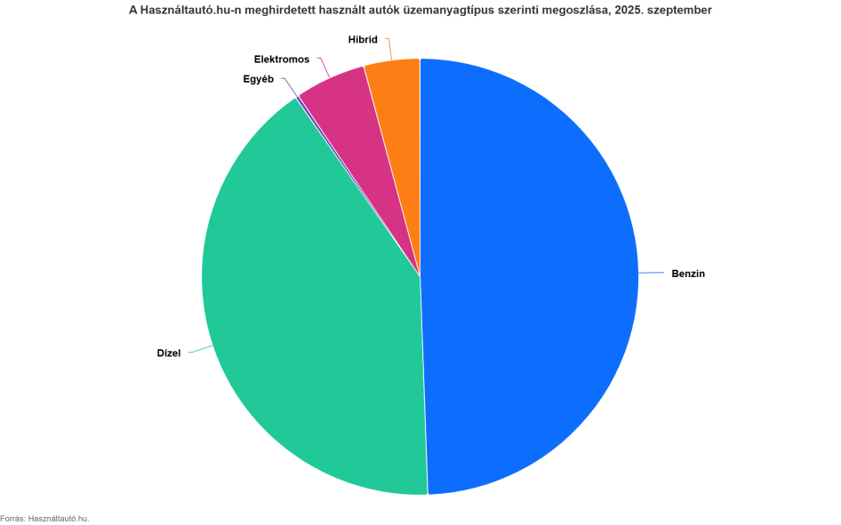 A Használtautó.hu-n meghirdetett használt autók üzemanyagtípus szerinti megoszlása, 2025. szeptember