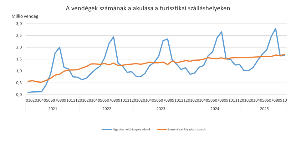 2025 októberében a turisztikai (kereskedelmi, magán- és egyéb) szálláshelyeken közel 1,7 millió vendég 3,8 millió vendégéjszakát töltött el. A vendégek száma 11, a vendégéjszakáké 10 százalékkal több volt az egy évvel korábbinál, amelyhez az október 23-ai ünnepnaphoz kötődő hosszú hétvége is hozzájárult.