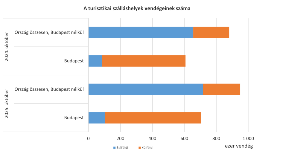 2025 októberében a turisztikai (kereskedelmi, magán- és egyéb) szálláshelyeken közel 1,7 millió vendég 3,8 millió vendégéjszakát töltött el. A vendégek száma 11, a vendégéjszakáké 10 százalékkal több volt az egy évvel korábbinál, amelyhez az október 23-ai ünnepnaphoz kötődő hosszú hétvége is hozzájárult.