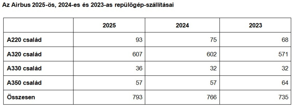 A továbbra is összetett és dinamikus üzleti környezetben a 2025-ös szállítások változatlanul emelkedő tendenciát mutattak. Az év során minden régióban új üzemeltetők is forgalomba állítottak A220, A321XLR, A330neo és A350-1000 típusokat. Az Airbus ismét fontos megrendeléseket szerzett mind az egyfolyosós, mind a széles törzsű repülőgépek piacán. A széles törzsű repülőgépek rendelésállománya új év végi rekordot ért el 1124 repülőgéppel.