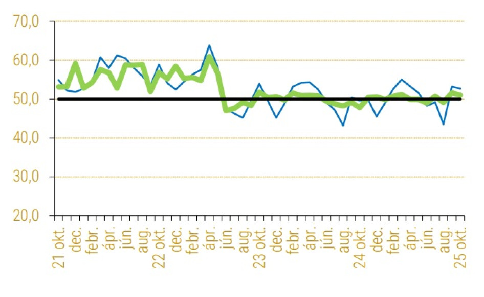 • A késztermékkészletek indexe októberben csökkent az előző hónaphoz képest, de értéke a készletszint emelkedésére utal. A korábbi e havi értékeket vizsgálva az idei érték átlag felettinek tekinthető, ez a tizenharmadik legmagasabb e havi indexérték 1995 óta. 2020-ban hat bővülő hónapot mértünk, 2021- ben és 2022-ben is tízet, 2023-ban ismét hatot, 2024-ben pedig négyet.