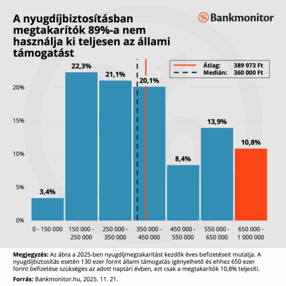 A Bankmonitor friss adatai szerint a 2025-ben nyugdíjmegtakarítást indítók 89 százaléka nem használja ki teljes mértékben az állami támogatást. Nyugdíjbiztosítás esetén ez azt jelenti, hogy a többség évi 650 ezer forintnál kevesebbet fizet be – így pedig jelentős, könnyen elérhető támogatást hagy az asztalon.