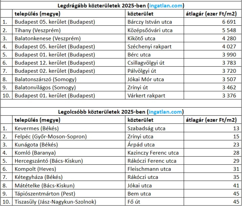 Továbbra is rendkívül széles skálán mozognak a lakásárak, és az egyes közterületek árszintjei között is többszázszoros különbségek mutatkoznak. A legdrágább utcákban több millió forintos négyzetméterárakkal találkozhatnak a vevők, addig a lista végén mindössze tízezres a nagyságrend. A KSH legfrissebb hivatalos adataiból jól látható, hogy a legolcsóbb települések többsége kisebb vidéki városokból és falvakból került ki, ahol a lakáspiaci kereslet általában gyengébb. Ezzel szemben a legdrágább utcák szinte kivétel nélkül a főváros legértékesebb részein, elsősorban a budai kerületekben és az V. kerületben találhatók, kiegészülve néhány balatoni lokációval – derül ki az ingatlan.com a legfrissebb hivatalos és a saját adatok alapján készült összeállításából, amely a múlt évi és idei rangsorokat is bemutatja.