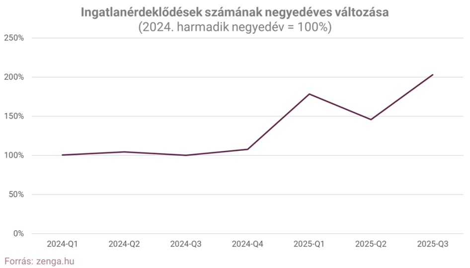 Kétszer annyi ingatlanérdeklődés volt 2025 harmadik negyedévében, mint az egy évvel ezelőtti hasonló időszakban, ám az idei év második negyedévével összevetve is közel 40 százalékos volt az emelkedés – derül ki a zenga.hu teljes aktív hirdetésállományának adataiból. Az élénkülő kereslet pedig az árakban is meglátszott, a július és szeptember közötti időszakban tovább gyorsult az éves árnövekedés mértéke, ami a települések ár szerinti sorrendjében is hozott változásokat.