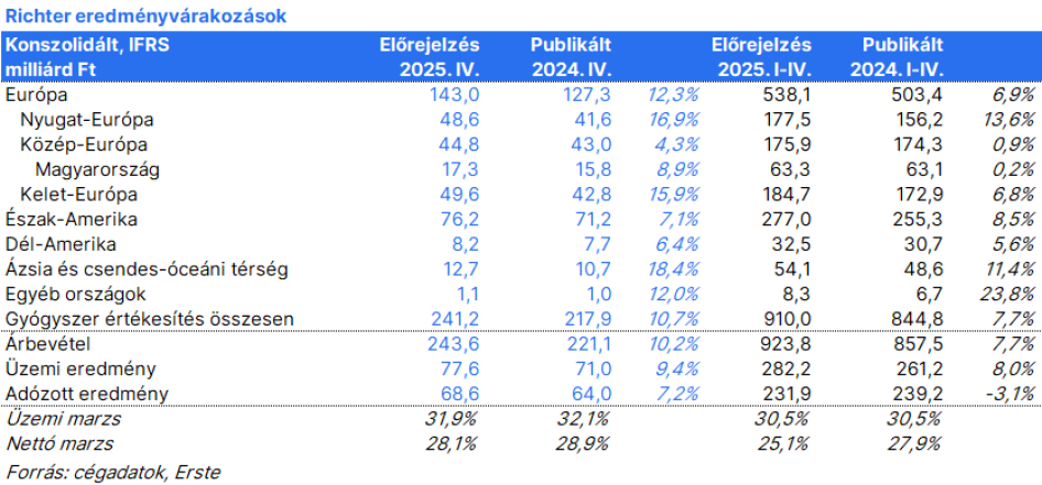 Az Erste előrejelzése szerint a magyarországi értékesítés 9 százalékkal 17,3 milliárd forintra emelkedhetett. Oroszországban alacsony bázisról növekedhetett az értékesítés, ami a rubel erősödésével együtt azt eredményezhette, hogy a kelet európai árbevétel 15,9 százalékkal 49,6 milliárd forintra emelkedhetett. A nyugat-európai eladások továbbra is erősek maradhattak, 17 százalékkal bővülve 48,6 milliárd forintra emelkedhettek, főleg a nőgyógyászati és a bioszimiláris készítményeknek köszönhetően. A Vraylar amerikai értékesítése 10,5 százalékkal 1,02 milliárd dollárra emelkedett, azonban a forint erősödésének hatása miatt az észak-amerikai bevétel csak 7 százalékkal 76,2 milliárd forintra bővülhetett. Összességében 10,2 százalékkal 243,6 milliárd forintra emelkedhetett a Richter bevétele.