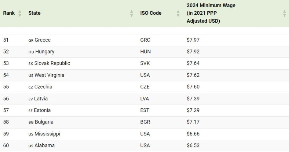 Azok az amerikai államok, amelyek a szövetségi minimálbért követik (amely 2008 óta nem változott), a rangsor alsó végén helyezkednek el, közelebb a felső-közepes jövedelmű gazdaságokhoz, mint például Kolumbia és Peru.