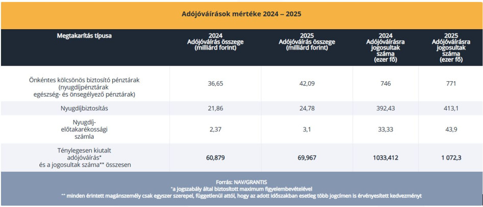 A 2024-es évről szóló idei szja-bevallásokból kiderül, hogy a legtöbb adójóváírást az önkéntes nyugdíjpénztárakban és az egészség- és önsegélyező pénztárakban takarékoskodók kívánták érvényesíteni, 771 ezer fő 42,09 milliárd forintot. Tavalyhoz képest ez 5,44 milliárd forinttal nagyobb érték.