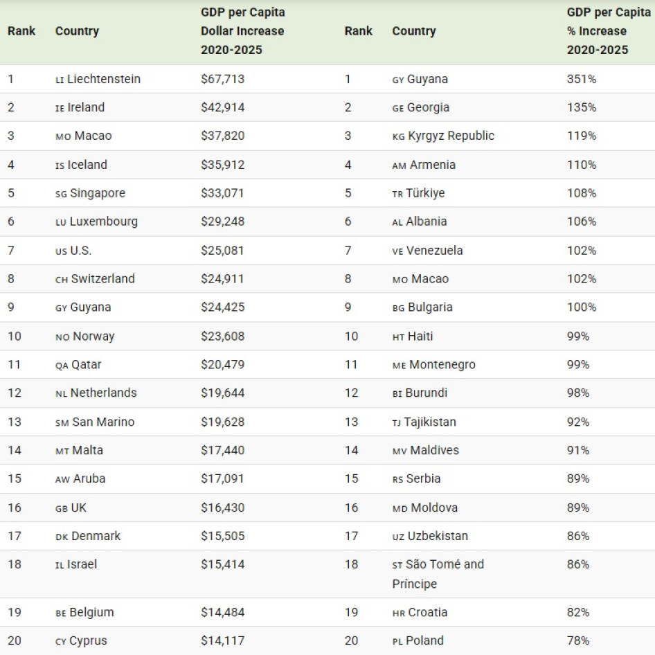 Liechtenstein egy főre jutó GDP-je 67 713 dollárral nőtt 2020 óta, ami a legnagyobb abszolút növekedés világszerte. Guyanában volt tapasztalható a legnagyobb százalékos növekedés az egy főre jutó GDP-ben, öt év alatt 351 százalékkal, amit a gyorsan bővülő olajiparának köszönhet az ország.