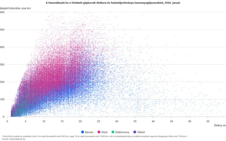 A hajtáslánc szerinti kínálati átlagárak alapján 2026 januárjában a hibridek voltak a legdrágábbak, 11,4 millió forintos átlagárral. Az elektromos modellek átlagára 10,9 millió forintra csökkent. A dízelüzemű személygépkocsik átlagosan 5,5 százalékkal voltak drágábbak a benzines modelleknél. Éves szinten a hibridek ára 6,7 százalékkal, az elektromosoké 11,2 százalékkal csökkent.