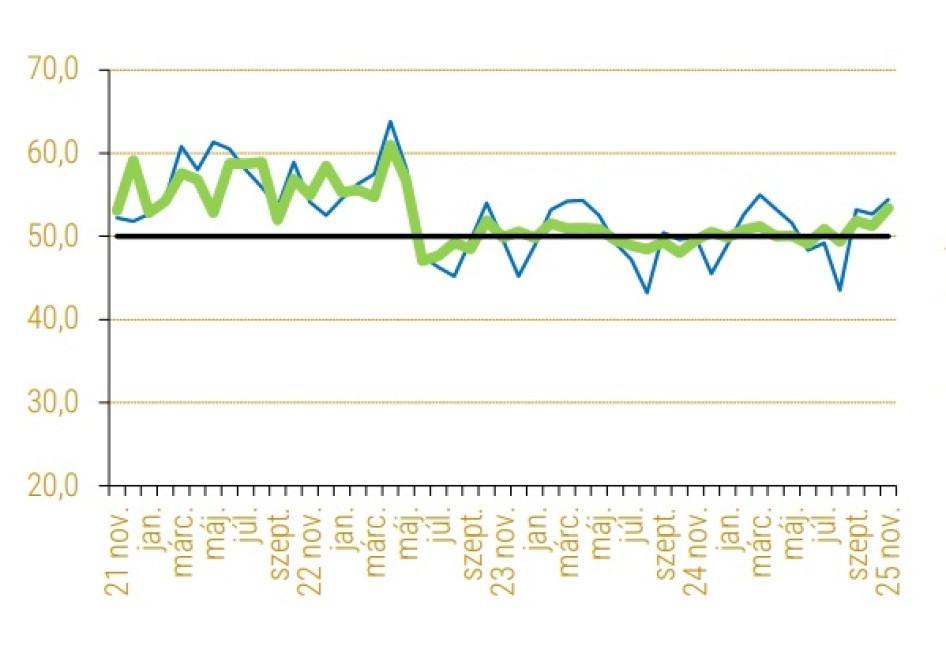Az új rendelések mennyisége index 6,1 százalékponttal nőtt, továbbra is bővülést mutat. A termelési mennyiség nőtt, az indexérték 3,3 százalékponttal magasabb az előző hónap értékéhez képest. A foglalkoztatás indexe ezúttal 50,0 pont felett áll, az indexérték további 0,7 százalékponttal nőtt. A szállítási átfutási idő index ismét 50,0 alatt áll, értéke 3,2 százalékponttal esett vissza ebben a hónapban. A vásárolt készletek index értéke 1,2 százalékponttal nőtt, továbbra is bővülést mutat. A külpiaci mutatók közül az import indexe 3,9 százalékponttal csökkent, az exporté 2,1 százalékponttal nőtt. A beszerzési árak emelkedtek, az index értéke 2,6 százalékponttal nőtt az előző hónaphoz képest. A beszerzési mennyiség indexe nem változott, az index stabil emelkedést jelez. A késztermékkészletek indexe 2,7 százalékponttal emelkedett. A 2025 novemberi BMI index nőtt az októberi (51,2) értékhez képest. November átlag feletti hónapnak számít (az 1995 óta mért hosszú távú átlag értéke 52,6; a novemberi értékeké 52,4). A most mért szezonálisan kiigazított BMI indexérték a tizenharmadik legmagasabb e havi érték.