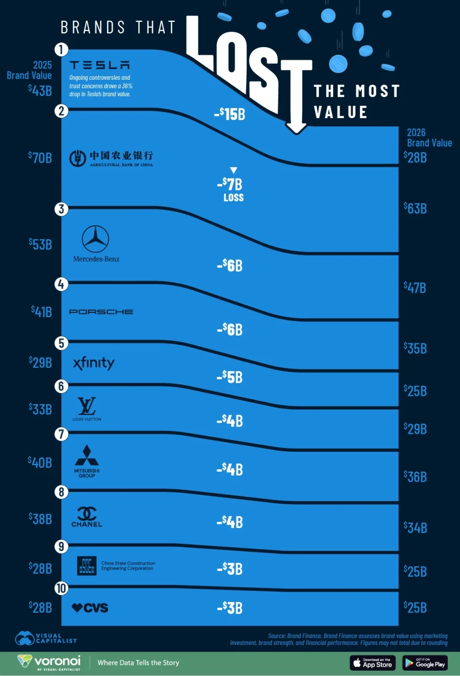 A Tesla a világ legnagyobb márkái közül a legnagyobb márkaérték-csökkenést könyvelte el, körülbelül 15 milliárd dollárral esett a mutató az előző évhez képest. A márkaérték-csökkenésben autógyártók uralják a listát, ami a globális autóiparra nehezedő nyomást és a változó fogyasztói hangulatot tükrözi.