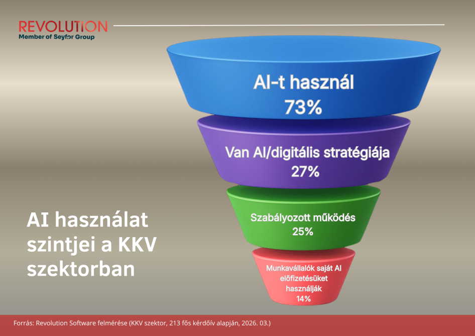 A hazai vállalkozások 73 százaléka már használ mesterséges intelligenciát valamilyen formában, de csupán minden negyediknél vannak szabályozott keretek az alkalmazására. Úgy tűnik, az AI gyorsabban terjed, mint ahogy a vállalatok képesek lennének rendszerszinten használni– derül ki a Revolution Software több mint 200 kkv bevonásával készült AI-digitális kutatásából.