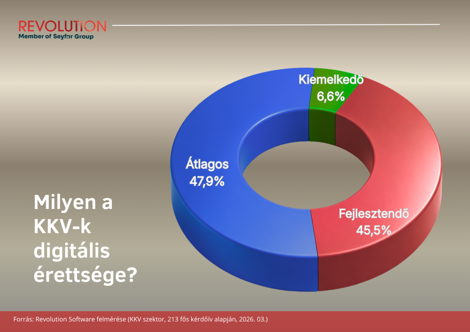 A felmérés komplexen is vizsgálta a vállalatok digitális érettségét; többek között a folyamatok dokumentáltsága, a működési hibák visszakövethetősége, az AI-szabályozás terén. Az eredmények alapján a vállalatok közel fele (45,5 százalék) digitálisan fejlesztendő kategóriába tartozik, további 47,9 százalék pedig csak átlagos szinten működik, és mindössze 6,6 százalék tekinthető valóban kiemelkedőnek. Ez azt jelenti, hogy a cégek többsége már túllépett az analóg működésen, de még nem jutott el oda, hogy folyamatai stabilan, rendszerszinten és skálázható módon működjenek. Azok a vállalkozások, akik digitálisan érett kategóriába tartoznak, jellemzően már ügyviteli, ERP megoldással is rendelkeznek.