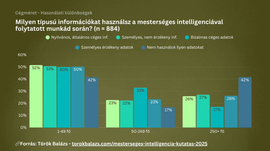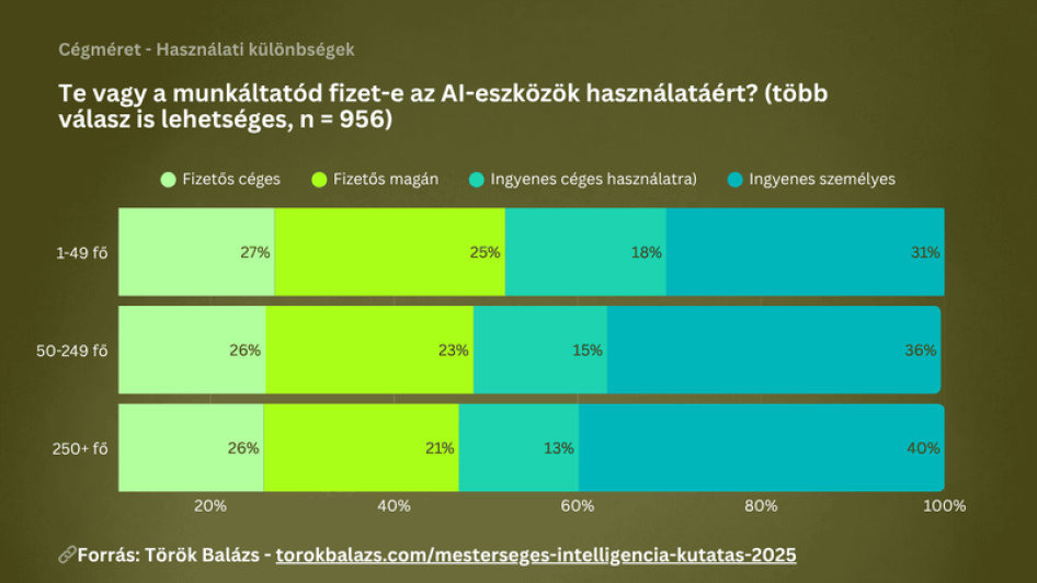 Az előfizetések terén is a mikrovállalkozások és a kis cégek a legaktívabbak: az 50 fő alatti körben már 51 százalék rendelkezik valamilyen fizetős hozzáféréssel. Mégis minden kategóriában mindössze 25–26 százalék kap céges előfizetést; a többiek saját zsebből fizetnek a prémium funkciókért. Ez torz ösztönzőket szül és tovább növeli az összevissza használatot: nem mindig egyértelmű, melyik chatben, melyik modellben, milyen beállításokkal készül egy anyag és kinek van jogosultsága módosítani.