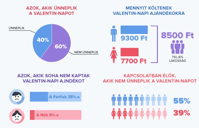 Az első és legfontosabb: a magyarok nem nagyon szeretik a Valentin-napot. A megkérdezettek kevesebb mint fele (szám szerint 40 százaléka) tartja és ünnepli ezt a napot. Az eredmény még így is valószínűleg örömmel tölti el az étterem-, ajándékbolt tulajdonosokat, mozikat valamint ékszerészeket – ezek bizonyultak a legnépszerűbb ajándék lelőhelyeknek. A férfiak 21 százaléka étterembe viszi szíve választottját, 20 százalék az ékszerek mellett teszi le a voksát és csaknem 50 százalék készül virággal, virágcsokorral.