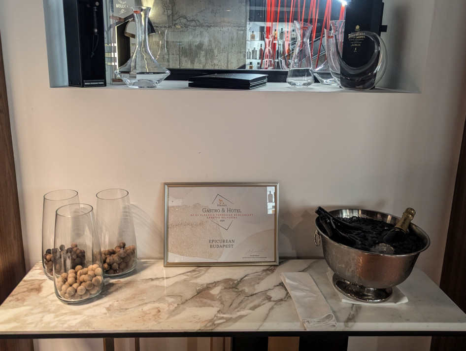Ez a díj jó helyre került – ez volt az első gondolatunk, amikor elhelyezkedtünk az Epicurean étterem fogadóterének is nevezezhető Oak Barban, és megláttuk a helyszín által 2025-ben elnyert Klasszis TopDesign díjról szóló oklevelet. Ez nem csak egy rendkívül hangulatos bár, bárpulttal: ez egyben egy érlelőszoba is, ahol kézműves sonkák és szalámik indítják be az ínyenc látogatók (vagy ha úgy tetszik: a boldogságot a mértéletes élvezetekben kereső epikureusok) fantáziáját.