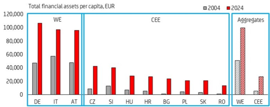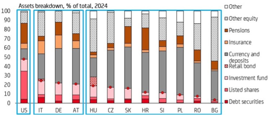 A régió háztartásai óvatosak az eszközallokáció terén: a készpénz és a betétek a fő eszközeik. Ebből fakad a nagyobb diverzifikáció lehetősége is, azaz, hogy a háztartások növeljék például a pénzpiaci eszközökbe (kötvényekbe, részvényekbe és alapokba) elhelyezett vagyonuk arányát.
