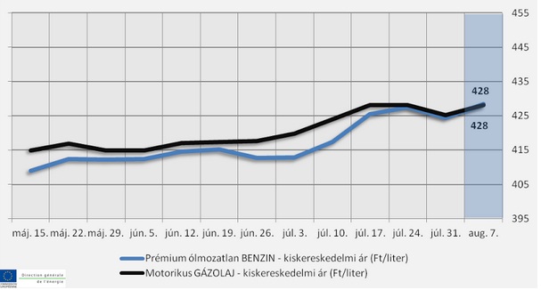 A nemzetközi piaci folyamatok összességében – a 27%-os áfával is növelten – a benzinnél 4, a gázolajnál 2-3 forintos emelést indokolnak. A fenti változások alapján a benzin kiskereskedelmi átlagára 428 forintra, a gázolaj kiskereskedelmi átlagára 427-428 forintra emelkedhet. (A heti frint üzemanyag-árak adatait az Eurostat heti üzemanyagár statisztikájából vesszük, a magyar árakat a MEKH szolgáltatja az Eurostatnak.)