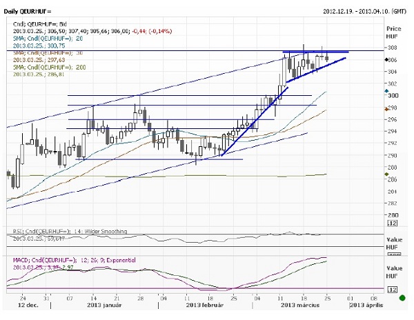 A nemzetközi devizapiacon pénteken erősödni tudott az euró a dollárral szemben. Az EURUSD értéke 1,2899-ről 1,2929-re emelkedett, annak ellenére is, hogy a németországi IFO index a vártnál gyengébb lett. Az euró ma reggel további erősödést mutat a dollárral szemben, miután Ciprus problémáit sikerült rendezni. Jó hangulatban telt a hét utolsó kereskedési napja a tengerentúli börzéken, a nap végéig emelkedtek az indexek (Dow 0,63%, Nasdaq 0,7%, S&P500 0,72%). Vegyesen zártak pénteken az európai piacok, nagy mozgások nem voltak (FTSE100 0,07%, DAX -0,27%, CAC40 -0,13%). Ázsiában ma a Nikkei 1,68%-ot, a Hang Seng 0,57%-ot emelkedett, miközben a Shanghai index értéke nem változott érdemben. Fontosabb makroadat ma reggel nem jelent meg a Távol-Keleten. Az árupiacon a WTI típusú kőolaj ára 94,16 dollárra nőtt ma reggel a ciprusi megállapodás után, míg az arany 1,607 dolláron stagnált. Várható, hogy az olaj ára tovább nő az elmúlt hetek gyengülése után, míg az arany esetében a megnyugodó kedélyek miatt valószínűleg csökkenhet a kurzus. Mind az amerikai, mind az európai határidős indexek pluszban vannak ma reggel.