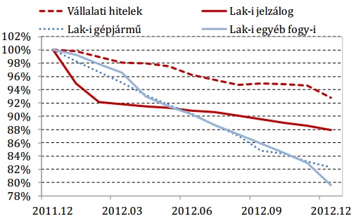 A lakossági gépjármű hitelek és az egyéb lakossági fogyasztási hitelek állománycsökkenése (az egész évet tekintve 17,7%, illetve 20,4%) lényegesen nagyobb mértékű volt a jelzáloghitel állomány zsugorodásánál. Jelzésértékű, hogy az áruvásárlási hiteleket is tartalmazó, egyéb fogyasztási hitelek állománya decemberben lényegesen, 4%-kal csökkent.