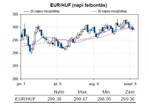 A forint valamivel 300 alatt kezdte a tegnapi kereskedést, majd a délelőtti órákban gyengülni kezdett a hazai fizetőeszköz egészen 300,4-ig. Innen ismét az erősödés vette át a főszerepet, 298,3-ig zuhant a kurzus, majd zárásra 299-ig emelkedett vissza. Ez alapján azt mondhatjuk, hogy meglehetősen volatilis napja volt a forintnak, az árfolyam napok óta a 20 és 30 napos mozgóátlag között oldalaz.