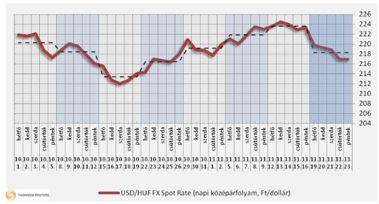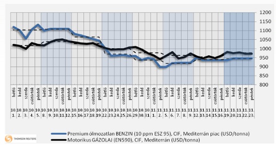 A nemzetközi piaci folyamatok összességében – a 27%-os áfával is növelten – a benzin esetében 2 forint csökkentést, míg a gázolaj esetében változatlan árakat indokolnak november 26-án, hétfőn. A fentiek miatt várhatóan csak a benzin kiskereskedelmi átlagára mérséklődik 407 forintra, a gázolaj ára 427 forint maradhat november 28-án, szerdán.