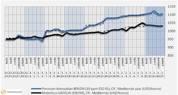 A hazai üzemanyagárak változását alapvetően két tényező alakítja: az üzemanyagok nemzetközi piaci árváltozása és a forint-dollár árfolyamának alakulása. A prémium ólmozatlan benzin (10 ppm ESZ 95) tonnánkénti ára (dollárban) a mediterrán piacon az elmúlt héthez képest átlagosan 1%-kal nőtt. A motorikus gázolaj (EN590) jegyzésára heti átlagban 0,7%-os emelkedést mutatott. A forint árfolyama a dollárral szemben az elmúlt hét átlagában egy hajszálnyit (0,2%) erősödött. A hét folyamán a kóolaj (Brent) ára a hétfői 119,5 dollárról péntekre 118,5 dollár/hordós szintre mérséklődött. Az üzemanyagok jegyzési ára az európai piacokon eltérő ütemben változott, az észak-európai piacokon erősebb volt a benzin áremelkedése, mint a dél-európai, mediterrán piacon, a Reuters adatai szerint.