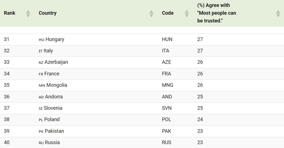 A 2022-es, 2024-ben közzétett felmérési adatok szerint az északi országokban a legtöbb emberben meg lehet bízni. Dánia, Norvégia, Finnország, Svédország és Izland az első hat hely közül ötöt foglal el.