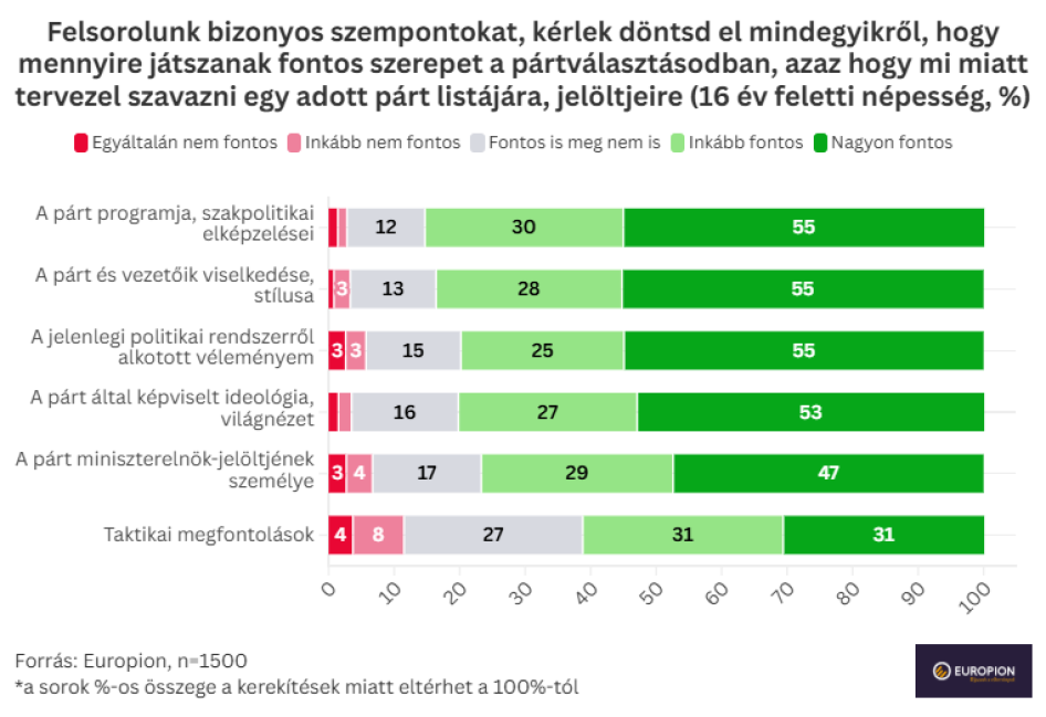 A politikai táborok összehasonlításában éles választóvonal mutatkozik meg: míg a kormánypárti szavazók körében az ideológia (64 százalék), a párt programja (60 százalék) és a miniszterelnök-jelölt személye (58 százalék) a leginkább meghatározó, addig a Tisza Párt szimpatizánsait elsősorban a jelenlegi politikai rendszerről alkotott (negatív) véleményük (77 százalék) és a Tisza párt programja (70 százalék) motiválja. Korosztályok tekintetében érdekesség, hogy a miniszterelnök-jelölt személye a legidősebb, 60 év feletti korcsoportban kiugróan fontos (59 százalék), míg a 16-29 éves fiataloknak csupán 34 százaléka tartja ezt kiemelten lényegesnek. Településtípusok szerint is jelentős az eltérés: a falvakban élők 53 százaléka, a budapestieknek viszont csupán 45 százaléka tekinti nagyon fontosnak a listavezető személyét. A jövedelmi helyzet szintén differenciál: a magas jövedelműek körében a párt programja kiemelkedően fontos (66 százalék), míg az alacsony jövedelműeknél ez az arány csak 50 százalékot ér el.