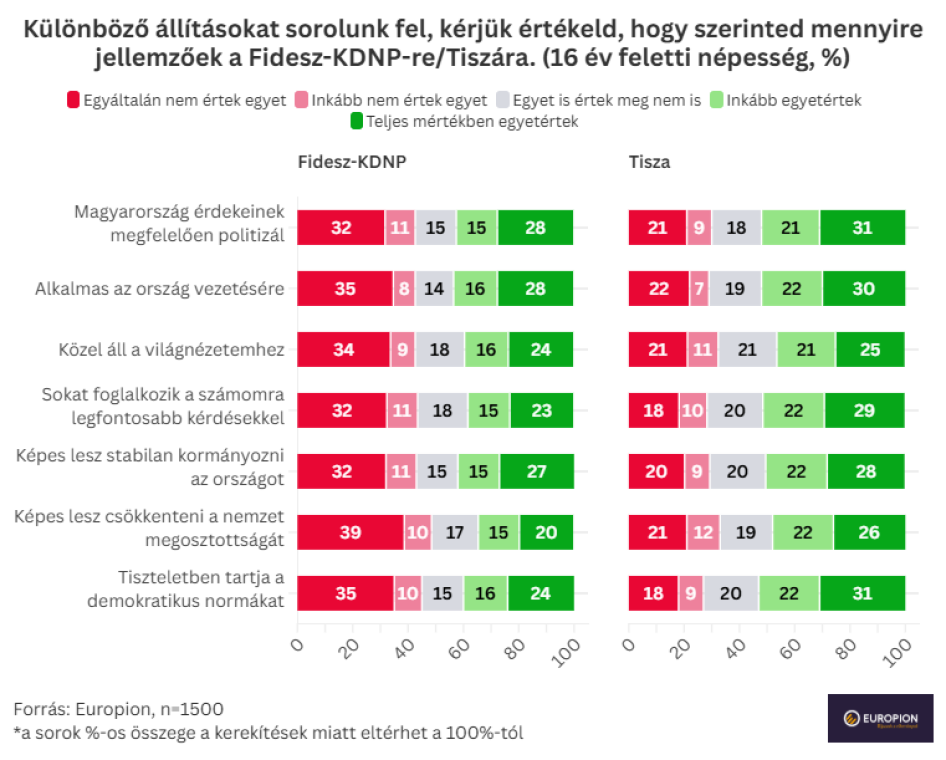 A Fidesz-KDNP-hez társított leggyakoribb jelzők a teljes népesség körében a korrupt (54 százalék), a hataloméhes (54 százalék), a megosztó (51 százalék) és a veszélyes (43 százalék). Ugyanakkor a pragmatikus kormányzóképességet elismerve a válaszadók 36 százaléka tapasztaltnak, 31 százaléka pedig harciasnak látja a kormánypártot. A populista, demagóg jelzőt a társadalom 30 százaléka aggatja a kormánypártra. A saját szavazótáboruk értékelései értelemszerűen ettől jelentősen eltérnek: a kormánypártiak az átlagnál jóval nagyobb arányban nevezték meg a hazafias (57 százalék), a tapasztalt (64 százalék) és a hiteles (51 százalék) jelzőket. A Fidesz megítélésében az iskolai végzettség éles határvonalat képez: míg az érettségivel nem rendelkezők 29 százaléka tartja hazafiasnak a kormánypártot, a diplomások körében ez az arány mindössze 15 százalék. Ezzel szemben a Tisza Párt imázsa a teljes népesség körében inkább a modernizációhoz és a nyugati orientációhoz kapcsolódik: a leggyakoribb említések a modern, fiatalos (49 százalék), az európai (45 százalék) és a demokratikus (35 százalék). A párt megosztó jellegét azonban a válaszadók 35 százaléka szintén megjelölte. A Tisza szavazói körében kiugróan magas az európai (83 százalék) és a modern (82 százalék) jelzők aránya, míg a kormánypárti szavazók a Tiszát elsősorban hataloméhesnek (71 százalék) és veszélyesnek (67 százalék) tartják. Érdekesség, hogy a Tisza modern, fiatalos imázsa leginkább a diplomások (58 százalék) és a 16-29 éves korosztály (63 százalék) körében rezonál a leginkább, míg az 50 év felettiek kevésbé azonosítják ezekkel a jelzőkkel (41-46 százalék).