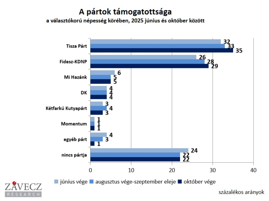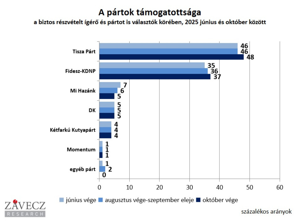 A biztos elmenetelt ígérők és pártot is választók csoportjában a Tisza Párt 48 százalékos, a Fidesznek 37 százaléka van. A jelenlegi erőviszonyok alapján aktuálisan még három pártnak lenne esélye a parlamentbe jutásra: a Mi Hazánk és a Demokratikus Koalíció az aktív szavazók körében 5-5 százalékon áll, a Kétfarkú Kutyapárt pedig 4 százalékon – ezek a legérdekesebb eredményei a ZRI Závecz Research Intézet október 23-a után végzett közvélemény-kutatásának. A felmérés 1000 fős mintán készült az ország felnőtt népességét reprezentáló mintán, telefonos adatfelvételi módszerrel.