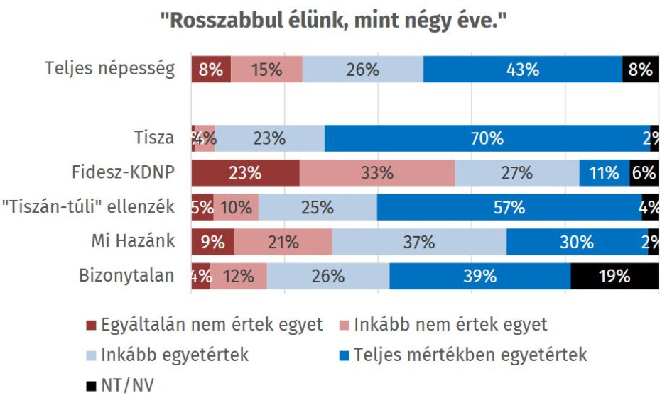 Még a kormánypárti szavazók véleménye is megoszlik a kérdésben, a Fidesz-KDNP szavazók 38 százaléka szerint rosszabbul élünk, mint négy éve.