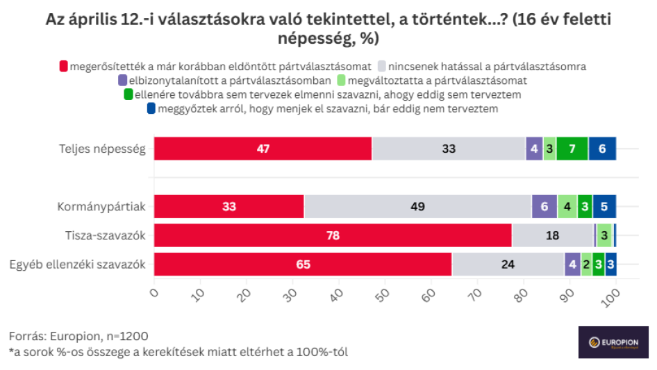 Végül de nem utolsósorban a kutatás kitért a történtek a magyarok pártválasztására gyakorolt hatására is. Noha az ilyen típusú „önelemzést” igénylő kérdések közismerten nehezen mérhetőek fel egy kérdőíves közvélemény-kutatás keratein belül, a nagyságrendek így is árulkodóak. A megkérdezettek döntő többsége (összesen 80 százaléka) pártválasztását a történtek vagy megerősítették, vagy nem gyakorolt rájuk hatást. Egy 7 százalékos kisebbséget (ez a kormánypárti táboron belül 10 százalék, egyéb ellenzéki szavazók körében 6 százalék, a Tisza-szavazók körében pedig csak 4 százalék) azonban a történtek elbizonytalanítottak (4 százalék), vagy egyenesen megváltozatta a szavazási szándékukat (3 százalék). Egy további 6 százalék pedig arról számolt be, hogy eddig nem tervezett részt venni a választásokon, de a történtek fényében mégis az urnákhoz fog járulni április 12.-én.