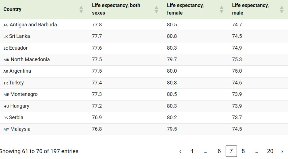 A nagyobb gazdaságok közül Ausztrália (84,1), Dél-Korea (84,4) és Olaszország (83,9) vezeti a világot, míg az Egyesült Államok 79,5 évvel lemaradva a top 40-en kívül esik.