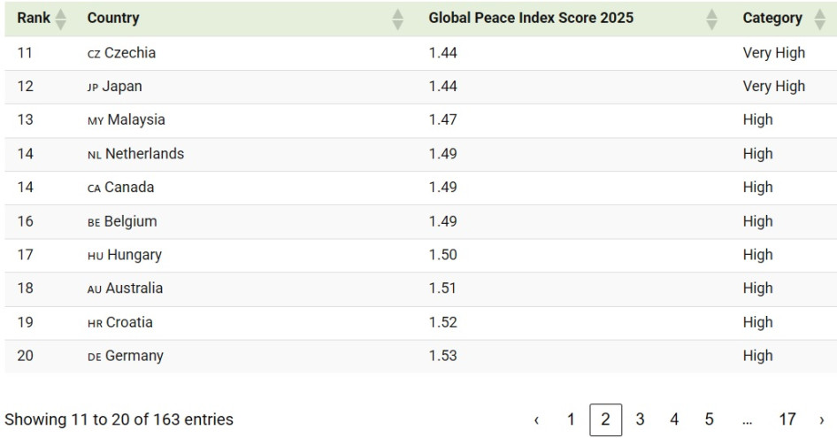 Az első helyen Izland áll, amely az elmúlt 17 egymást követő évben vezeti a globális eredménytáblát. Összességében mindössze 12 ország esett a „nagyon magas” kategóriába, ezek közül kilenc Nyugat- és Közép-Európában található. A legfontosabb kiugró országok közé tartozik Új-Zéland (3), Szingapúr (5) és Japán (12). Magyarország a 17. helyre került.