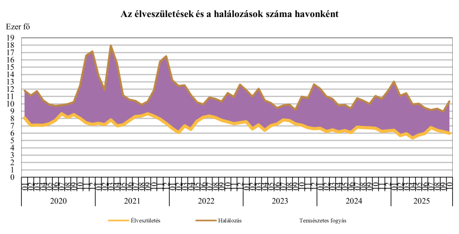 Az előzetes adatok szerint 2025 októberében 5979 gyermek született, és 10 333 fő halt meg. Az előző év azonos hónapjához képest a születések száma 10, a halálozásoké 6,8 százalékkal mérséklődött, míg a házasságkötéseké 14 százalékkal emelkedett.